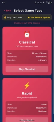 Choose between Classical (90 min) and Rapid (15 min) time controls with increments
