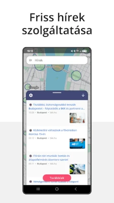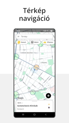 - Helymeghatározás: közeli megálló számítása, saját pozíció jelölése a térképen