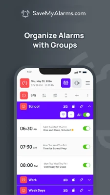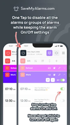 Are you tired of constantly turning your work alarms on and off, only to forget which ones need reset? Say goodbye to alarm chaos and hello to a smarter way of managing your day with SaveMyAlarms - Smart Alarm Manager. Whether you’re juggling school, work, weekend activities, or sports, this alarm organizer helps you organize your alarms effortlessly, ensuring you stay on top of your schedule without the hassle.